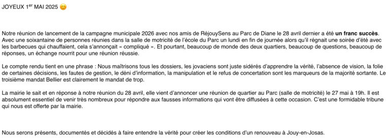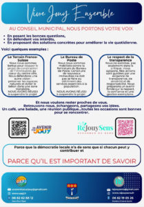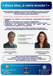 Cette campagne entend ainsi proposer non seulement un projet pour Jouy-en-Josas, mais aussi une méthode : une gouvernance fondée sur la transparence, la participation citoyenne et la recherche constante de l’intérêt général.